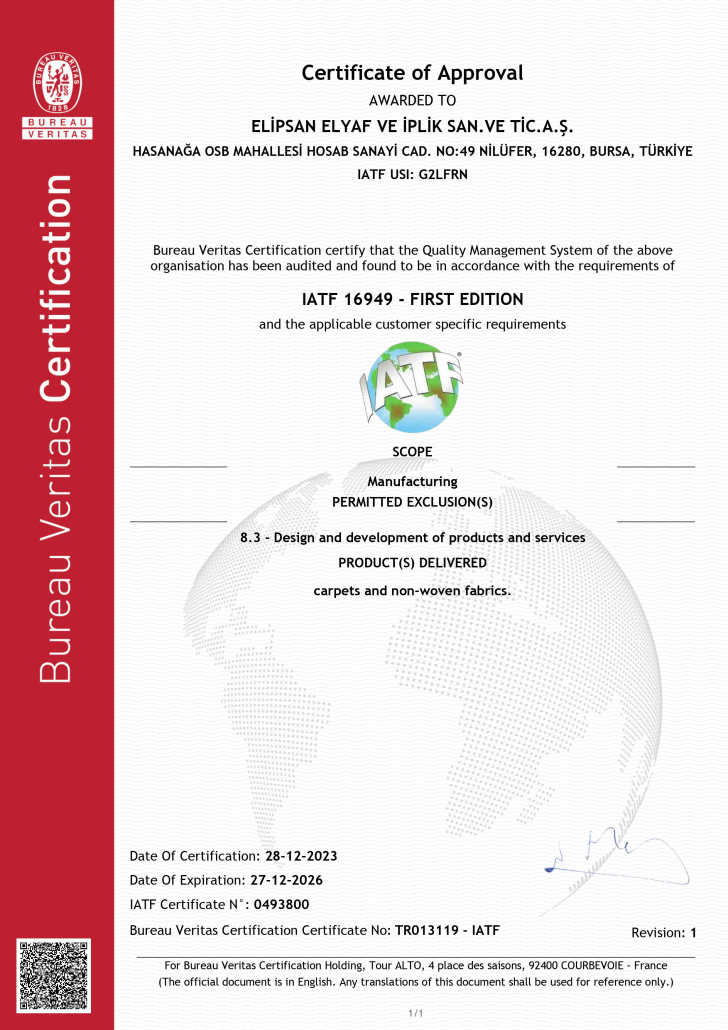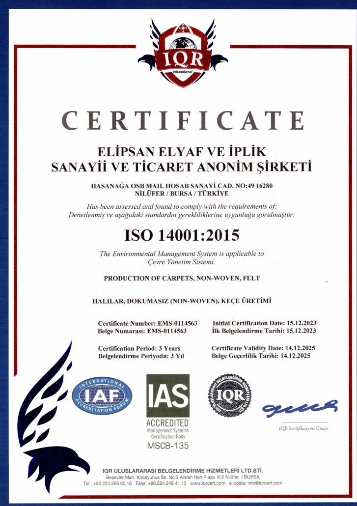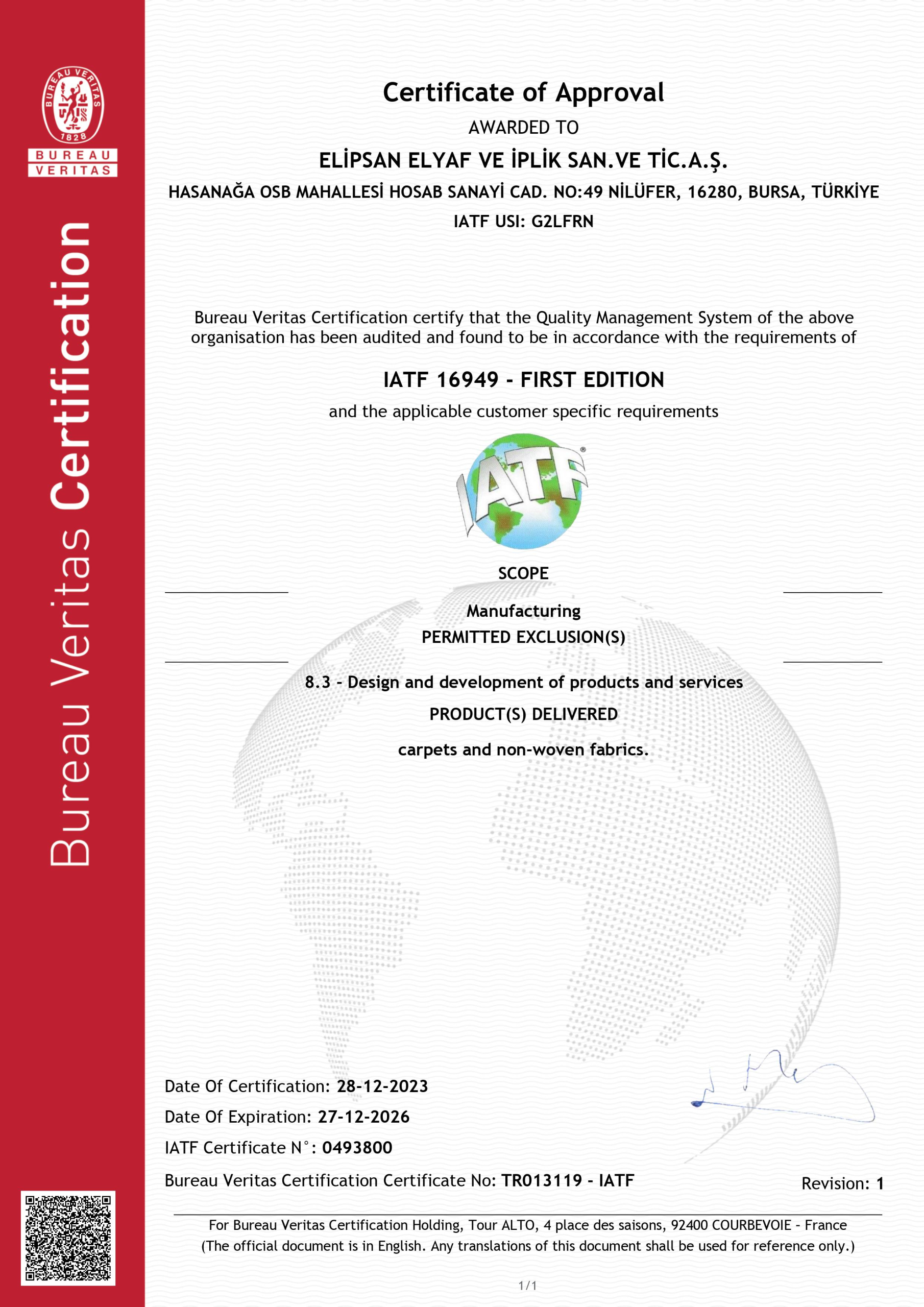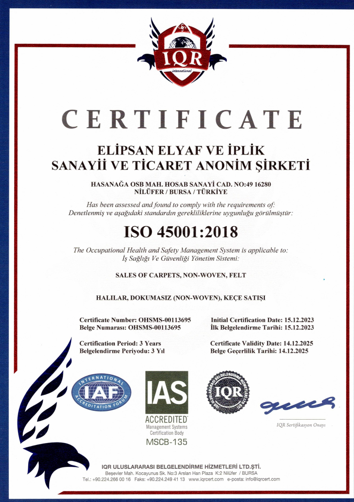 Elipsan, sahip olduğu ürünlerinin kalitesini IATF-16949, ISO-14001 ve ISO-45001 sertifikalarıyla belgelemiştir.