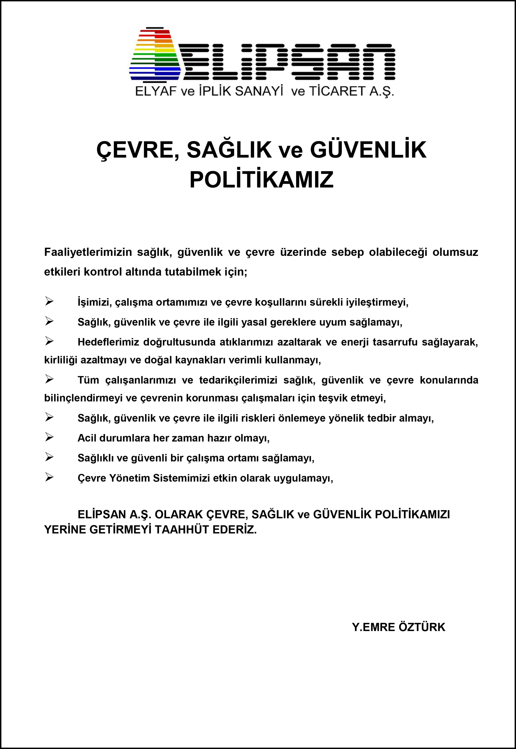 ÇEVRE, SAĞLIK ve GÜVENLİK POLİTİKASI